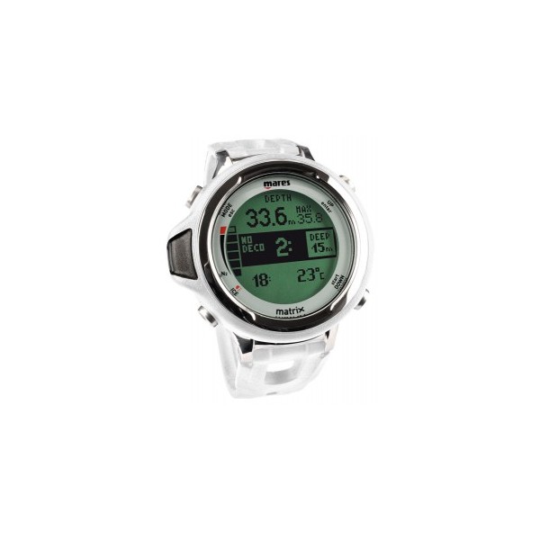 Un affichage haute résolution entièrement à matrice de points, une boussole avec compensation dinclinaison et fonction prise de cap, un profil graphique au cours de la plongée et un algorithme multigaz font probablement du Matrix lordinateur-montre le plus impressionnant de Mares.